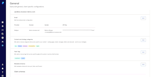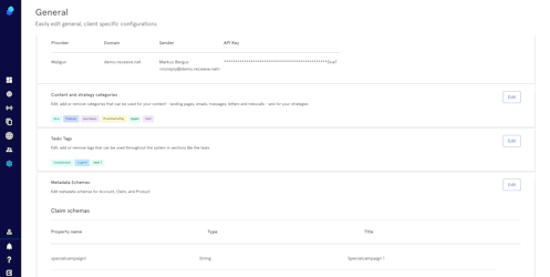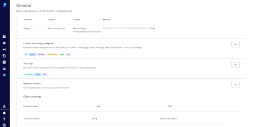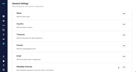To alter metadata schemes for Account, Claim, and Product, click Edit at the Metadata Schemes row. In the popover, follow these steps to continue: