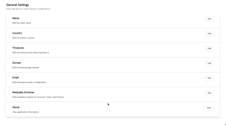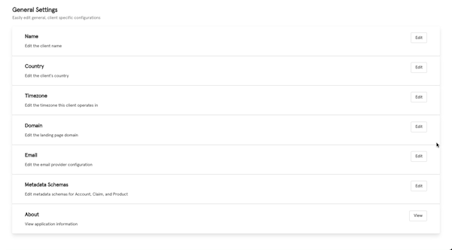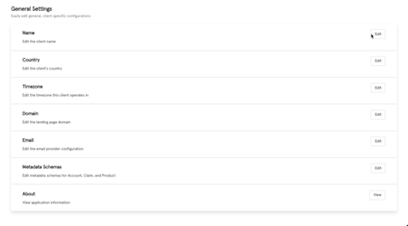 This feature will allow you to configure general and client specific details that appear throughout the platform like name, country, timezone, domain, email, metadata schemes, and about information.