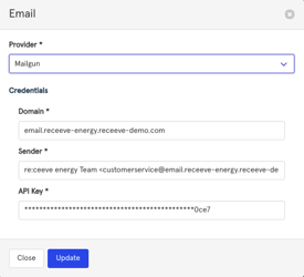 In this modal, select the provider name from the list, enter the domain, sender, and API key. Once all of this required information is filled, click Update. Alternatively, click Close to cancel.