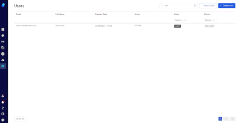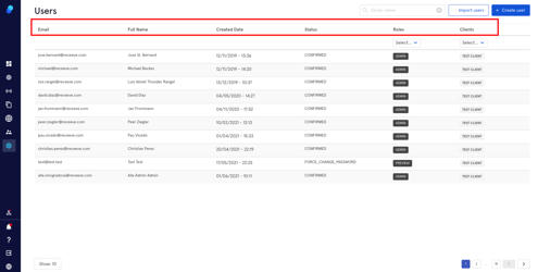 The User Management page displays information about the users: email address, full name, created date, status, role, and clients (meaning access to different instances).