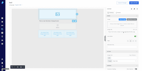 Drag and drop an image onto a block. Click on the image so you can adjust width, alignment, possible actions, and other design settings