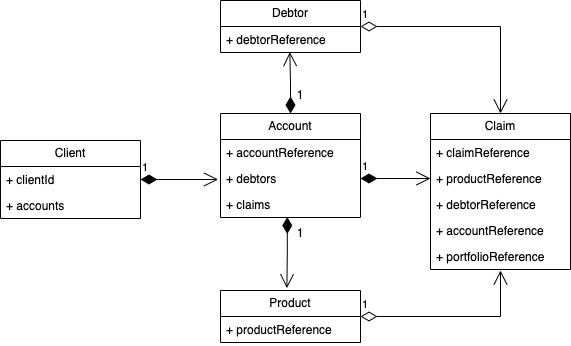 • Notice that every claim has a different productReference, so the Claims are grouped by Product. However, both Claims are related to the same Account and Debtor.