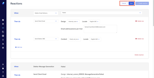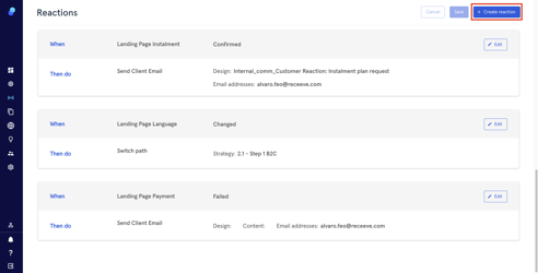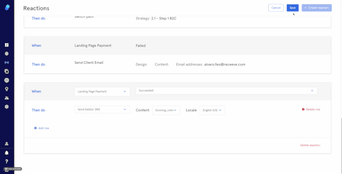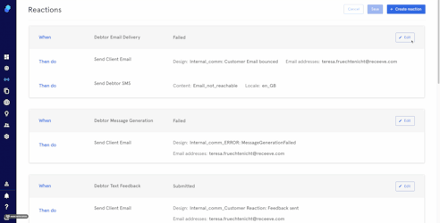 As explained in this article, Reactions allow us to do something simple like reacting to a a real-life event, or completely change the strategy and direction of a claim. The Reactions feature will enable you to set up reactions to any event in the system with predefined automatic responses.