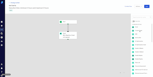 On the step library, locate the 'Custom email' step under the Communications section (Green) and then drag it to your strategy. You may also look for the step by typing in the Search box.