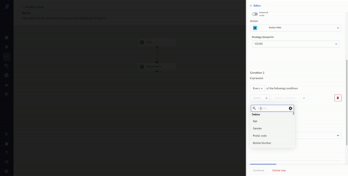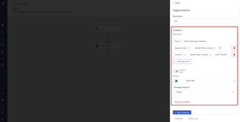 - Condition 1: We'll be sending claims that are 30 DPD (days past due) and equal or over 1000 € to a different strategy/path. This is how it would look: